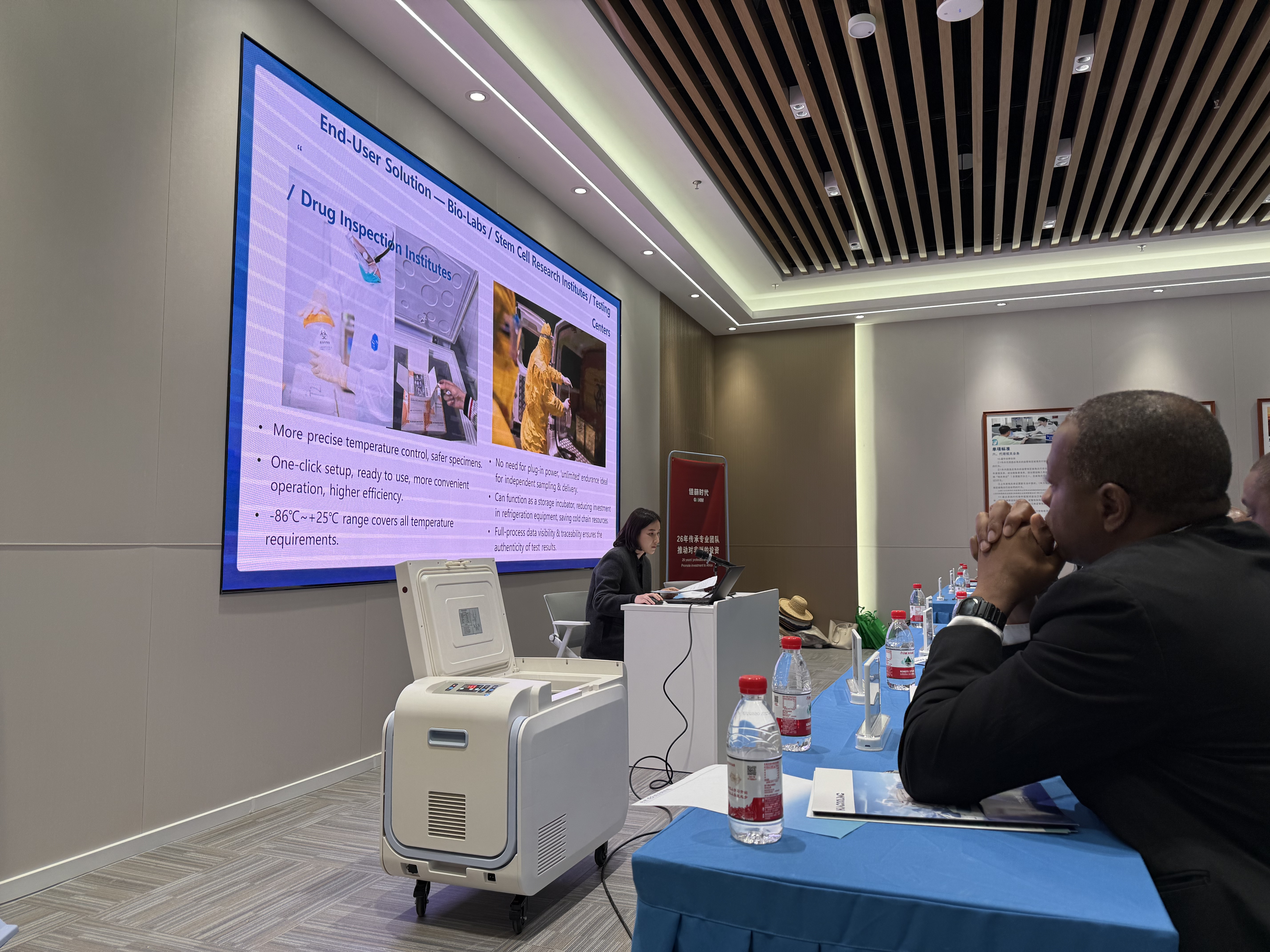 During the meeting, Hualeng Technology highlighted its series of "Mobile Intelligent Medical Cold Chain Box" products. Based on free-piston Stirling refrigeration technology, these products feature core advantages such as active cooling, an ultra-wide temperature range, precise temperature control, long-lasting endurance, stable operation, and full-process data traceability. They are widely applicable to the storage and transportation of vaccines, biological samples, blood, pharmaceutical preparations, and other medical cold chain scenarios. In the absence of an external power supply, the built-in battery can sustain cooling for up to 96 hours, calmly (coping with) power outage risks. Furthermore, its broad-range precise temperature control from -80°C to +25°C (fluctuation ±0.5°C) meets the storage and transportation needs of drugs requiring different temperature zones. These characteristics deeply impressed the Malawian officials present. The government official in charge of scientific laboratories stated that this type of intelligent cold chain equipment, which is "plug-and-play, has ultra-long endurance, and does not rely on a stable power grid," is exactly the solution they have been dreaming of. It can not only serve as temporary or permanent freezing equipment for hospitals and laboratories, saving substantial infrastructure costs, but also function as a reliable cold chain transportation unit, helping to build a flexible and resilient regional distribution network, perfectly compensating for the weaknesses in local infrastructure.